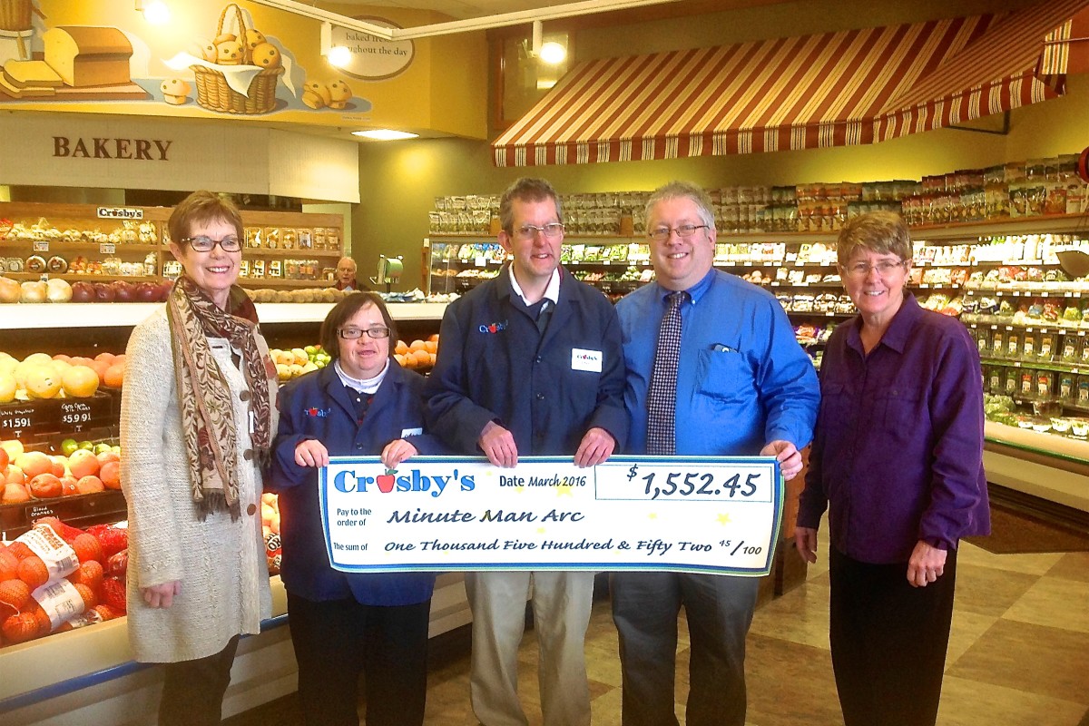 Photo: (L-R) Minute Man Arc CEO Jean Goldsberry, Ann Murphy, David Inferrera, Crosby’s Store Manager John Cummings, and Barbara Jean White, Minute Man Arc’s Employment Services Director